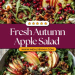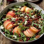 This Autumn Harvest Honeycrisp Apple and Feta Salad is a vibrant and flavorful dish perfect for fall. It features toasted pecans and pumpkin seeds glazed with maple syrup and warm spices, crispy prosciutto, peppery arugula, sweet honeycrisp apples, creamy avocado, juicy pomegranate arils, and tangy crumbled feta cheese, all tossed in a homemade apple vinaigrette infused with fresh herbs. A delightful balance of sweet, savory, and crunchy textures makes this salad ideal for a hearty lunch or a festive side dish.