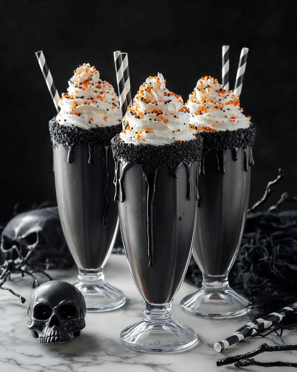 Pour your chillingly delicious black milkshake into the prepared glasses. Dollop with the whipped cream and sprinkle on your favorite Halloween-themed sprinkles if you like. I love how the white cream pops against the black shake—it’s like a little haunted swirl on top of a midnight potion.
