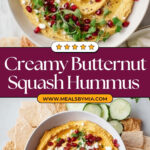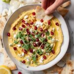 A vibrant and creamy Butternut Squash Hummus infused with warm spices and roasted garlic, topped with tangy feta cheese and juicy pomegranate arils. This appetizer combines the sweet and nutty flavors of butternut squash with the classic creamy texture of hummus, making it perfect for serving with pita, crackers, or fresh vegetables.