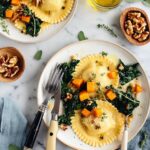 This Butternut Squash Ravioli recipe features tender homemade pasta stuffed with a smooth, flavorful filling of roasted butternut squash, sage, shallots, and walnuts. The ravioli is served with a fragrant sage and garlic butter sauce enhanced by white wine, topped with crunchy walnuts and optional roasted squash cubes, sautéed kale, and grated pecorino cheese for added richness and texture. A perfect fall-inspired dish that is both comforting and elegant.