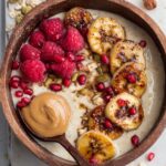 - Assemble and garnish: Spoon the warmed or chilled oatmeal into bowls. Top with the caramelised bananas, fresh raspberries, pomegranate seeds, a dollop of your favourite smooth nut butter, and a sprinkle of homemade granola for texture and flavor contrast.