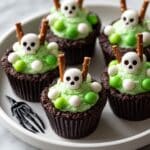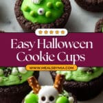 Cauldron Cookie Cups are a fun and festive Halloween treat made from rich devil’s food cake mix cookies shaped into mini cups and filled with vibrant green buttercream frosting. Decorated with spooky sprinkles, candy eyeballs, and pretzel stick stirrers, these delightful cookie cups are perfect for parties and gatherings.