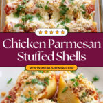 This Chicken Parmesan Stuffed Shells recipe features jumbo pasta shells filled with a savory mixture of ground chicken, ricotta, mozzarella, and Parmesan cheeses, baked in marinara sauce with a crispy Panko breadcrumb topping. It’s a comforting, family-friendly Italian-American dish perfect for dinner.