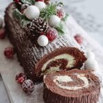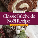 This Perfect Bûche de Noël (Yule Log) recipe features a fluffy chocolate chiffon cake rolled with a luscious white chocolate peppermint filling and coated with a rich dark chocolate ganache that resembles tree bark. Decorated with meringue mushrooms, sugared cranberries, rosemary sprigs, and almond pine cones, this festive dessert is an impressive centerpiece for holiday celebrations.