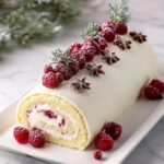 This Christmas Raspberry Cake Roll features a light and airy vanilla sponge cake layered with fresh raspberry jam, a smooth cream cheese filling, and topped with a luscious whipped white chocolate ganache. Garnished with fresh raspberries, rosemary, star anise, and a dusting of powdered sugar, this festive dessert is perfect for holiday celebrations.