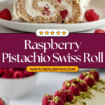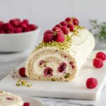 This Christmas Raspberry Pistachio Roulade, also known as Pistachio Swiss Roll, is a festive and elegant dessert featuring a light pistachio-infused sponge cake rolled with a luscious white chocolate cream and fresh raspberries. The roulade is beautifully decorated with extra raspberries and chopped pistachios, making it perfect for holiday celebrations or special occasions.