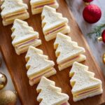 - Cut into Christmas trees: Using a tree-shaped cookie cutter, cut two tree shapes out of each sandwich, yielding 16 mini Christmas tree sandwiches in total.