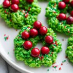 These festive Christmas Wreath Cookies are a fun and easy no-bake treat perfect for holiday celebrations. Made with buttery melted marshmallows mixed with crispy cornflakes and tinted green with food coloring, they are shaped into wreaths and decorated with bright red candies for a charming seasonal look.