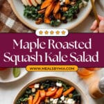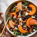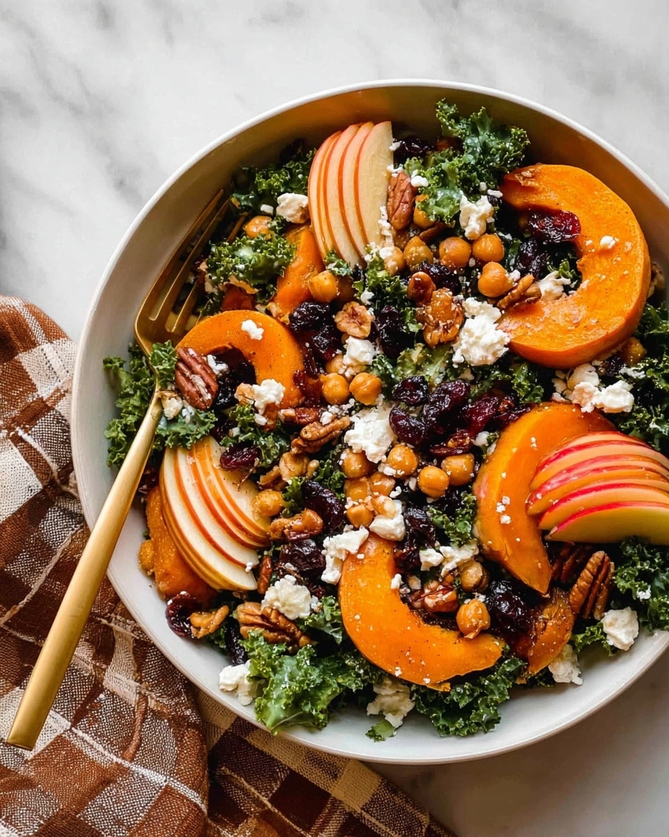 A vibrant and hearty salad featuring maple-roasted butternut squash and chickpeas seasoned with warm spices, combined with fresh kale, crisp apple slices, toasted pecans, dried cherries, and tangy crumbled goat cheese. Tossed in a sweet and tangy maple cider vinaigrette, this salad is perfect for fall and winter meals, offering a delicious balance of flavors and textures.