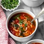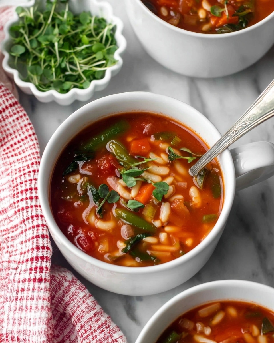 This Thick & Hearty Minestrone Soup is a comforting and nutritious dish packed with a medley of fresh vegetables, beans, and hearty rice or orzo pasta. Perfect for cooler days, this Italian-inspired soup simmers slowly to develop deep, rich flavors enhanced by Italian seasoning, fresh spinach, and a touch of red wine vinegar. It’s a wholesome meal ideal for serving in bread bowls or with a sprinkle of parmesan cheese for a fulfilling lunch or dinner.