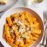 This Creamy Pumpkin Pasta is a comforting and flavorful dish perfect for fall or any time you crave a rich, creamy meal. Tender rigatoni pasta is combined with a luscious pumpkin sauce made from pumpkin puree, chicken broth, and cream, enriched with sautéed onion, garlic, and warm spices. Finished with Parmesan cheese and fresh parsley, this easy stovetop recipe delivers a deliciously satisfying dinner in just 30 minutes.
