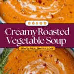 A smooth and creamy roasted vegetable soup bursting with rich caramelized flavors from a variety of roasted vegetables, blended to perfection with a touch of cream for a comforting and delicious meal.