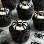 These Creepy Halloween Spider Cupcakes are a fun and festive treat perfect for spooky celebrations. Moist chocolate pumpkin cupcakes are topped with rich black buttercream frosting and decorated with white fondant spiders featuring tiny green sprinkle eyes, bringing a creepy-cute vibe to your Halloween party.