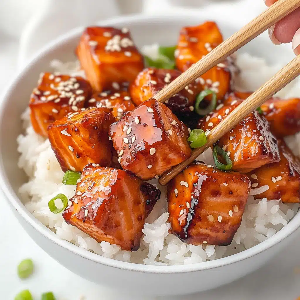 - Combine and Serve: Toss salmon with sauce, adjust seasonings, and serve over rice.