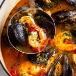 This classic Bouillabaisse recipe is a traditional French seafood stew showcasing a flavorful medley of halibut, mussels, scallops, and shrimp simmered in a rich, aromatic broth infused with fennel, garlic, saffron, and fresh herbs. Served with toasted baguette slices, it’s a comforting dish perfect for seafood lovers seeking a hearty, elegant meal.
