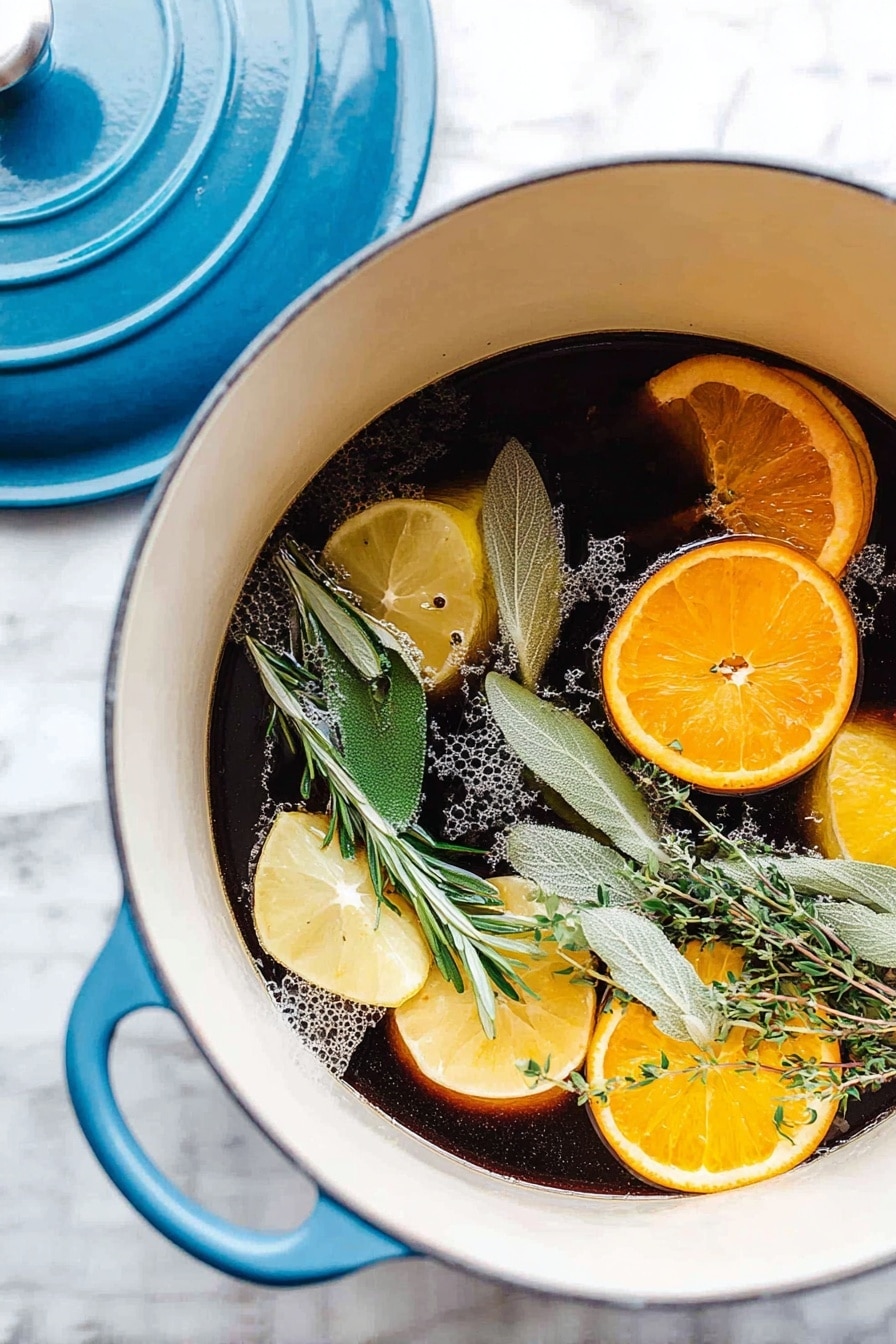 In a large stockpot, combine 1 quart of water, kosher salt, quartered lemons and oranges, rosemary, bay leaves, sage leaves, dried thyme, whole peppercorns, and maple syrup. Bring this mixture to a boil—this helps dissolve the salt and release the herb flavors beautifully. Once boiling, remove it from the heat and stir in the apple juice. Now, here’s a trick I learned: letting the brine cool completely before adding your turkey is crucial. Hot brine can start cooking your bird prematurely, which you definitely want to avoid.