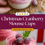 These Christmas Cranberry Mousse Cups are a festive layered dessert featuring a tart cranberry mousse balanced with a smooth vanilla mousse. Each cup displays vibrant cranberry flavor with a creamy texture, perfect for holiday celebrations. The mousse layers are carefully prepared with gelatin to set beautifully and garnished with sugared cranberries and fresh mint for an elegant presentation.
