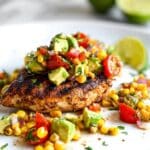 Fiesta Lime Chicken is a flavorful and vibrant dish featuring juicy chicken breasts rubbed with a zesty lime and chili spice blend, cooked to perfection on the stovetop or grill. Served with a fresh, chunky avocado salsa bursting with tomatoes, corn, red onion, bell pepper, jalapeno, and cilantro, this recipe combines bright citrus notes with smoky spices for a deliciously healthy meal that’s perfect for any occasion.