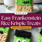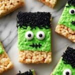 These Frankenstein Halloween Rice Krispie Treats are a fun and festive twist on the classic snack, perfect for Halloween parties and celebrations. Made by combining crispy rice cereal with marshmallows, then decorated with green and black candy melts, royal icing eyes, and sprinkles, these treats are both delicious and visually spooky.