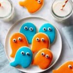 I like to keep it simple and classic — just those sweet frosting eyes with chocolate chips. But if you’re feeling festive, sprinkle edible glitter or a little sanding sugar over the ghosts for a magical shimmer. Sometimes I add tiny orange or blue candy sprinkles to tie in with the dough colors — it always makes guests smile.