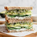 This Green Goddess Sandwich is a fresh, flavorful vegetarian option featuring a creamy Greek yogurt and mayonnaise-based sauce infused with fresh herbs like chives and tarragon. Layered with peppery arugula, sliced mozzarella, crisp cucumber, creamy avocado, and crunchy alfalfa sprouts on whole-wheat bread, it’s a quick and wholesome meal perfect for lunch or a light dinner.