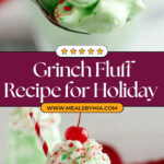 This festive Grinch Fluff is a creamy, colorful dessert perfect for holiday gatherings. Combining tangy cream cheese, sweet vanilla pudding, and fluffy marshmallows, all tinted a vibrant green, it’s a fun and easy no-bake treat that’s sure to delight both kids and adults alike. Garnished with whipped cream, sprinkles, and maraschino cherries, this fluffy salad brings a whimsical touch to your dessert table.