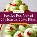These Grinchy Christmas Cake Bites are festive, bite-sized treats made from red velvet cookie crumbs and cream cheese, dipped in vibrant green white chocolate and adorned with red heart sprinkles. Perfect for holiday parties, these no-bake delights offer a rich and creamy texture with a festive twist.