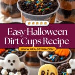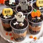 Halloween Dirt Cups are a fun and festive no-bake dessert perfect for Halloween parties. Layers of crushed Oreo cookies and creamy chocolate pudding are assembled in individual cups, then topped with spooky decorations like ghost Peeps, mini pumpkin candies, and Milano cookies decorated with ‘RIP’. This easy-to-make treat combines creamy, crunchy, and chocolaty textures to delight kids and adults alike.