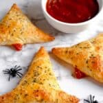 I always serve these witch hat calzones with warm marinara on the side for dipping. I simply microwave my favorite jarred marinara in 15-second bursts until warm enough; it’s quick and foolproof. The tangy sauce perfectly complements the rich, cheesy filling and buttery crust.
