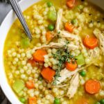 A hearty and flavorful chicken soup infused with fresh ginger, turmeric, rosemary, and thyme, complemented by pearl couscous and optional peas. This comforting recipe is easy to prepare, perfect for a nourishing meal any day of the week.