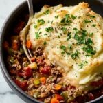 This Healthy Shepherd’s Pie recipe features a hearty filling of lean ground beef, fresh vegetables, and cabbage, topped with a smooth parsnip purée, combining comfort food with nutritious ingredients. It’s a wholesome, satisfying dish baked to golden perfection, ideal for family dinners or meal prep.