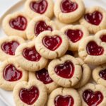 Delightfully charming Thumbprint Heart Cookies made with a soft buttery dough, baked to golden perfection, and filled with your choice of sweet jam. Perfect for gifting or sharing during special occasions, these cookies combine a classic texture with a festive heart-shaped twist.