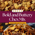 This Bold and Buttery Homemade Chex Mix is a deliciously crunchy snack blend made with a mix of Corn, Wheat, and Rice Chex cereals, mini pretzels, rye bagel chips, and mixed nuts. Coated in a rich buttery sauce infused with Worcestershire sauce and savory seasonings, this classic snack is baked to golden perfection, making it the perfect treat for parties or casual snacking.