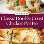 This Double Crust Chicken Pot Pie features a flaky homemade pie crust filled with tender chicken, carrots, celery, and peas in a rich, creamy herb-infused gravy. Perfect for a comforting family meal, it is baked to golden perfection with a buttery, flaky top crust and a luscious thick filling that’s great for leftovers.