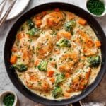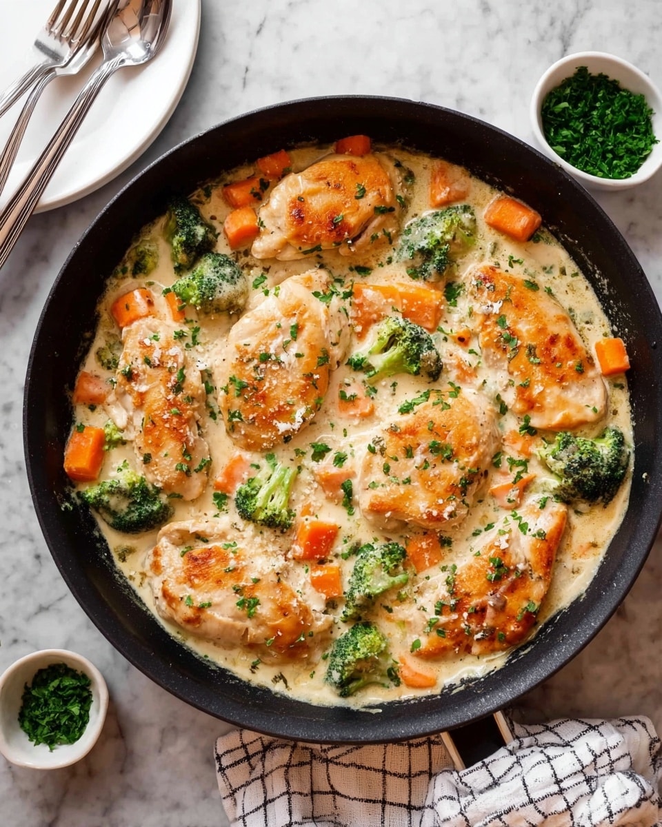 This Creamy Garlic Chicken & Vegetables recipe features tender chicken thighs baked with roasted broccoli and butternut squash, all enveloped in a rich, flavorful garlic cream sauce. Perfect for a comforting weeknight dinner, it combines simple ingredients with a luscious homemade sauce for a hearty, satisfying meal.