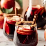 If you want to elevate the presentation, I highly recommend a cinnamon-sugar rim on your glasses. Mix the sugar and ground cinnamon, moisten the rim of each glass with water, and then dip it in the mixture. Pour or ladle the sangria with a bit of fruit into each glass and finish with a splash of club soda for that irresistible fizz. I always toss in a cinnamon stick as a garnish—it looks pretty and adds an extra hint of spice as you sip.