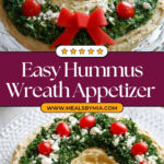 This Easy Christmas Appetizer Hummus Wreath is a festive and visually stunning dish perfect for holiday gatherings. It layers creamy hummus with crumbled feta and green onions, topped with a vibrant parsley mixture and decorated with cherry tomatoes to resemble colorful ornaments. A red pepper bow and a light dusting of feta create a snowy effect, making it both delicious and decorative. Simple to assemble and delightful to serve with pita chips or fresh veggies, it’s a crowd-pleasing appetizer that brings holiday cheer to your table.