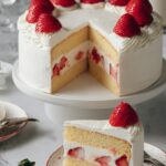- Assemble the cake: Level the cooled cake by slicing off the browned top. Cut cake into two even layers. Place one layer on a cake stand cut side up and brush with syrup. Spread a thin layer of whipped cream, arrange sliced strawberries evenly, then cover with another thin layer of cream. Place the second layer on top, brush with syrup, and frost the entire cake with whipped cream. Smooth the sides and top, then decorate with remaining strawberries. Chill if using stabilized cream before serving.