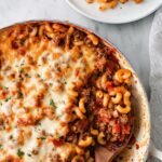Johnny Marzetti is a comforting American casserole featuring a hearty combination of elbow macaroni, Italian sausage, ground beef, vegetables, savory tomato sauce, and a rich blend of mozzarella and cheddar cheeses, baked to bubbly perfection.