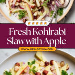 A refreshing and crunchy Kohlrabi Slaw featuring a tangy dressing made with olive oil, apple cider vinegar, and honey, complemented by crisp apple matchsticks, red onion, toasted hazelnuts, and fresh parsley. This vibrant and healthy salad is perfect as a light side dish or a standalone snack.
