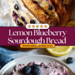This Lemon Blueberry Sourdough Bread combines the tangy complexity of sourdough with the fresh, bright flavors of lemon and blueberries for a delightful artisan loaf. The bread is naturally leavened, featuring a tender crumb studded with juicy blueberries and a zesty lemon aroma. Paired perfectly with whipped blueberry honey butter, it’s a refreshing twist on classic homemade sourdough bread that is perfect for breakfast, brunch, or an afternoon snack.