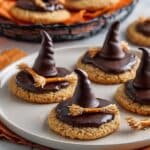 Delightfully spooky and fun Melted Witch Cookies that combine crunchy Bugles snacks, pretzel sticks, and whole wheat cereal to create an imaginative Halloween treat. These peanut butter-flavored cookies are decorated with rich cocoa candy melts to form whimsical witch hats and brooms, perfect for festive gatherings.