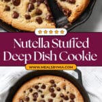 This Nutella Stuffed Deep Dish Cookie is a decadent, gooey treat baked in a cast iron skillet. Featuring a buttery, soft cookie dough filled with a rich Nutella center and studded with melty chocolate chips, it offers the perfect combination of crispy edges and a fudgy middle. Ideal for sharing, this dessert can be enjoyed warm by the spoonful or sliced like a pie once cooled.