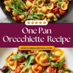 This One Pan Orecchiette with Chickpeas, Tomatoes & Olives is a simple, flavorful Italian-inspired pasta dish cooked entirely in one skillet. Combining tender orecchiette pasta with protein-packed chickpeas, tangy Kalamata olives, fresh cherry tomatoes, and peppery arugula, it’s finished with a sprinkle of Parmesan cheese and fresh herbs. Quick to prepare and perfect for a wholesome weeknight dinner, this recipe offers a balanced and satisfying meal using fresh ingredients and minimal cleanup.