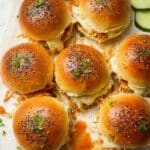 These Spicy Buffalo Chicken Sliders are perfect for game day or a flavorful snack. Tender shredded chicken tossed in Franks buffalo hot sauce and ranch dressing is piled high on slider buns, topped with melted cheese and garlic buttered tops for a deliciously spicy, savory treat.