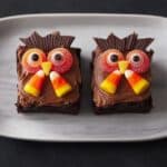 Place two gummy peach ring candies on each brownie for the big “owl eyes.” Then pop two candy eyeballs in the centers of those rings. Add a single candy corn for the nose right below the eyes. Finally, position two quartered peanut butter cups, cut side down, at the top of each brownie for those expressive eyebrows. This step is so much fun—I’ve found that you can get your kids involved here for an extra special family baking moment.