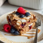 This Peanut Butter and Jelly Baked Oatmeal is a comforting and wholesome breakfast bake combining the classic flavors of peanut butter and jelly with hearty rolled oats. It’s easy to prepare, naturally sweetened with maple syrup, and baked until golden and set, making it a perfect meal to start your day or enjoy as a nourishing snack.