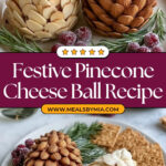 This visually stunning Pinecone Shaped Cheese Ball appetizer combines creamy Neufchatel and Gruyere cheeses with savory onion soup mix and toasted almonds to mimic the look of pinecones. Garnished with fresh rosemary and served with Wheat Thins, it’s a festive, flavorful centerpiece perfect for holiday gatherings and parties.