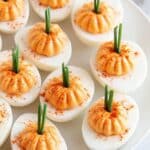 Pop on a small piece of chopped fresh chive to each egg for a stem. I love how the green pops against the orange filling! Finally, lightly sprinkle some smoked paprika over the tops for a subtle smoky flavor and that extra burst of fall color. Chill these beauties in the fridge until you’re ready to serve.