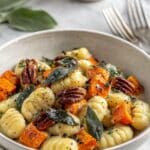 This comforting Pumpkin Gnocchi Bake combines tender cubes of roasted pumpkin with pillowy gnocchi, creamy cheeses, crunchy pecans, and crispy sage leaves. Perfectly cooked in either an air fryer or oven, this dish is a delightful autumnal meal that’s easy to prepare and bursting with rich, hearty flavors.